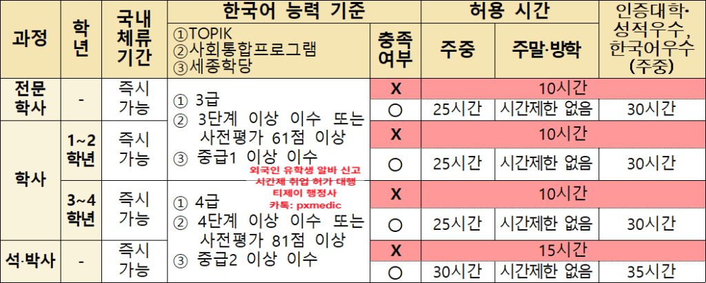 성적 미달 유학생 시간제취업 허가 가능 여부를 판단할 때, 이러한 언어 성적 대체 가능성도 꼼꼼히 살펴봐야 합니다.