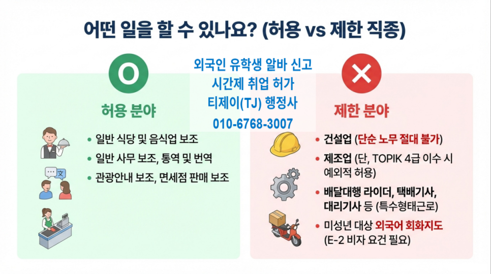 2026년 유학생 알바 허용 시간 및 금지 업종 지침을 보면, 무분별한 취업을 막기 위해 장소와 기간을 엄격히 제한하고 있습니다.