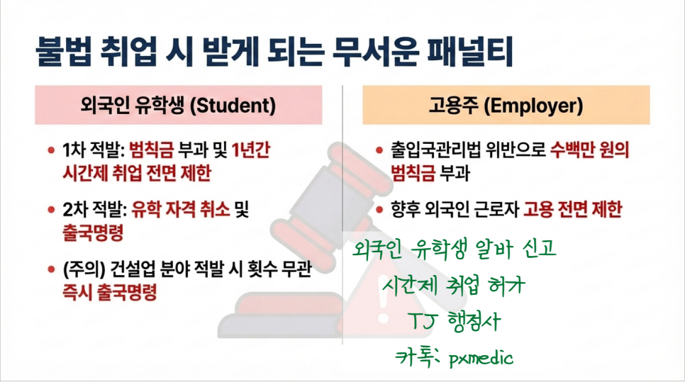이를 누락하고 근무하다 적발될 경우, 유학생은 강제 출국이나 비자 연장 거부의 불이익을, 고용주는 무거운 범칙금 처분을 받을 수 있습니다. (실제로 많이 일어나고 있는 현실입니다.)